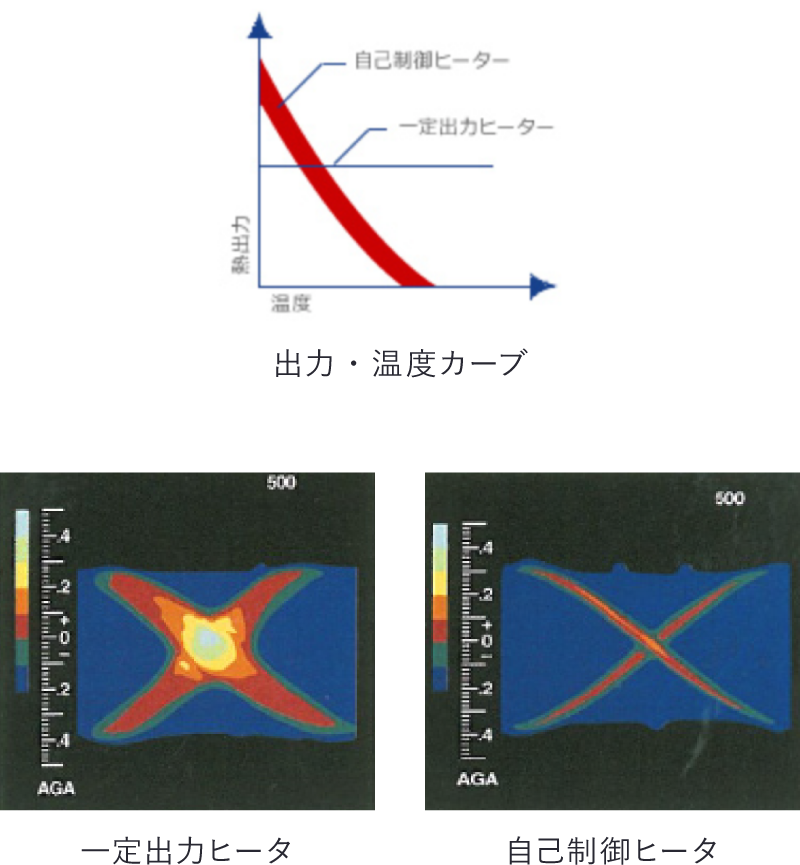 これらの特⻑から、ヒータ同⼠を交差して使⽤しても、⾃⼰制御性が働いて過加熱をピンポイントで防ぎ、過熱によるヒータの焼き切れもありません。