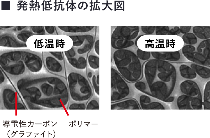 反対に⾼温度では、放射線架橋ポリマーが膨張して、電流通路を少なくします。その結果、抵抗値を増⼤させることで、発熱量を減少させます。右グラフは上述の状態を⽰しています。