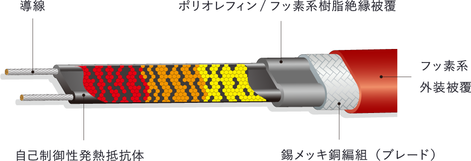 レイケムブランドのオート・トレースヒータ(自己制御型ヒータ)は、サーモスタットを使用しなくても異常加熱したり焼き切れたりすることがありません。信頼性の高い安全な電気加熱保温が行えます。また、発熱体が連続的な並列回路構造をしているため、現場で必要な長さに切ったり、重ね巻きすることもできます。