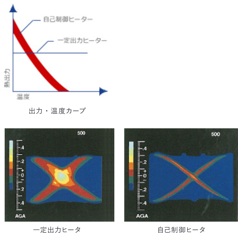 これらの特⻑から、ヒータ同⼠を交差して使⽤しても、⾃⼰制御性が働いて過加熱をピンポイントで防ぎ、過熱によるヒータの焼き切れもありません。