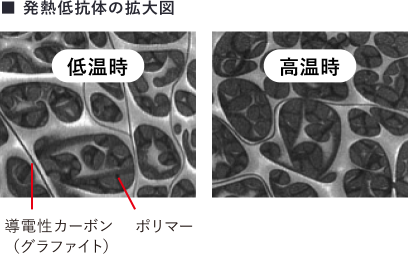 反対に⾼温度では、放射線架橋ポリマーが膨張して、電流通路を少なくします。その結果、抵抗値を増⼤させることで、発熱量を減少させます。右グラフは上述の状態を⽰しています。