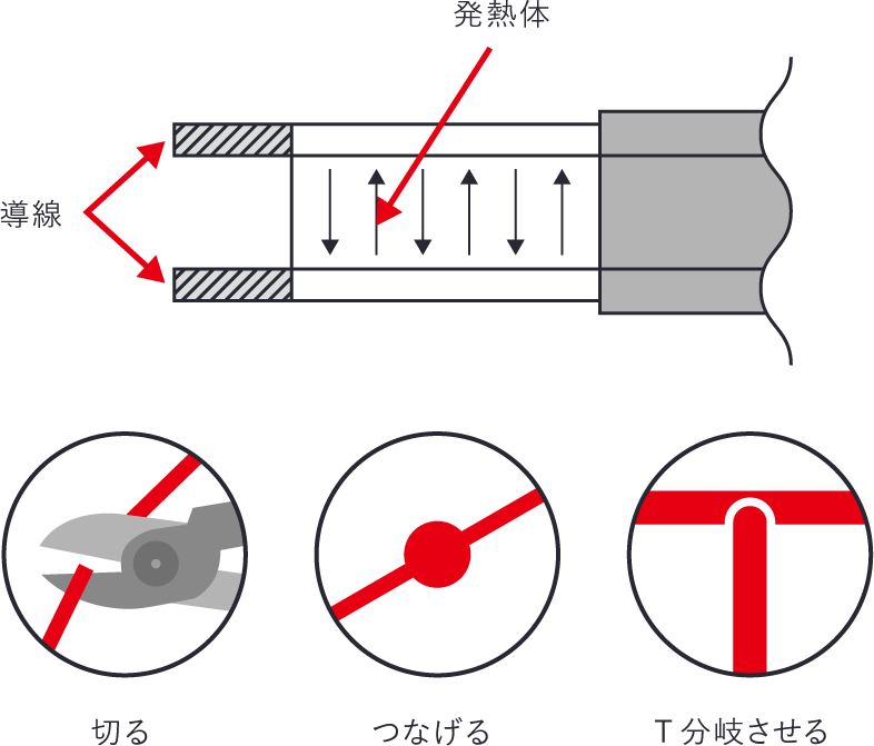従って、2本の導線間の単位⻑当りの発熱量は、⾃⼰制御ヒータの⻑さが変わっても不変のため、⾃由な⻑さに切る、つなげる、T分岐させることが可能です。