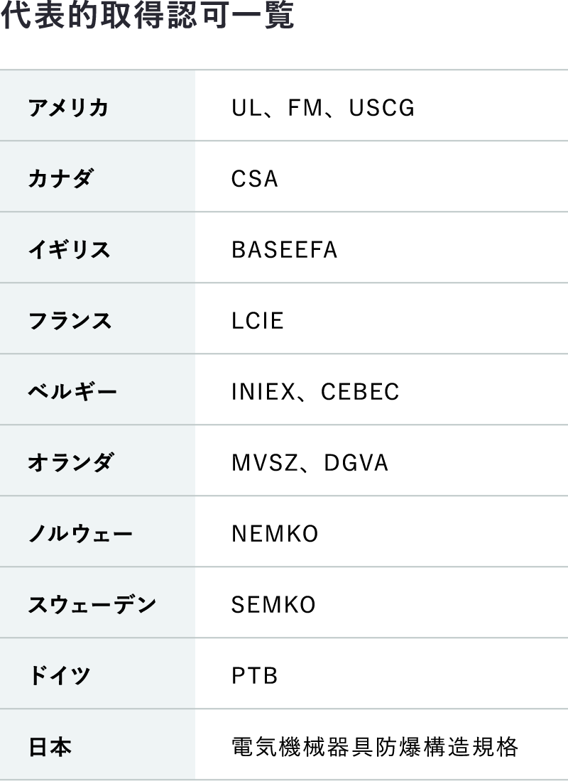 ・国内1種および2種危険場所または、第⼀類および第⼆類危険箇所で使⽤可能